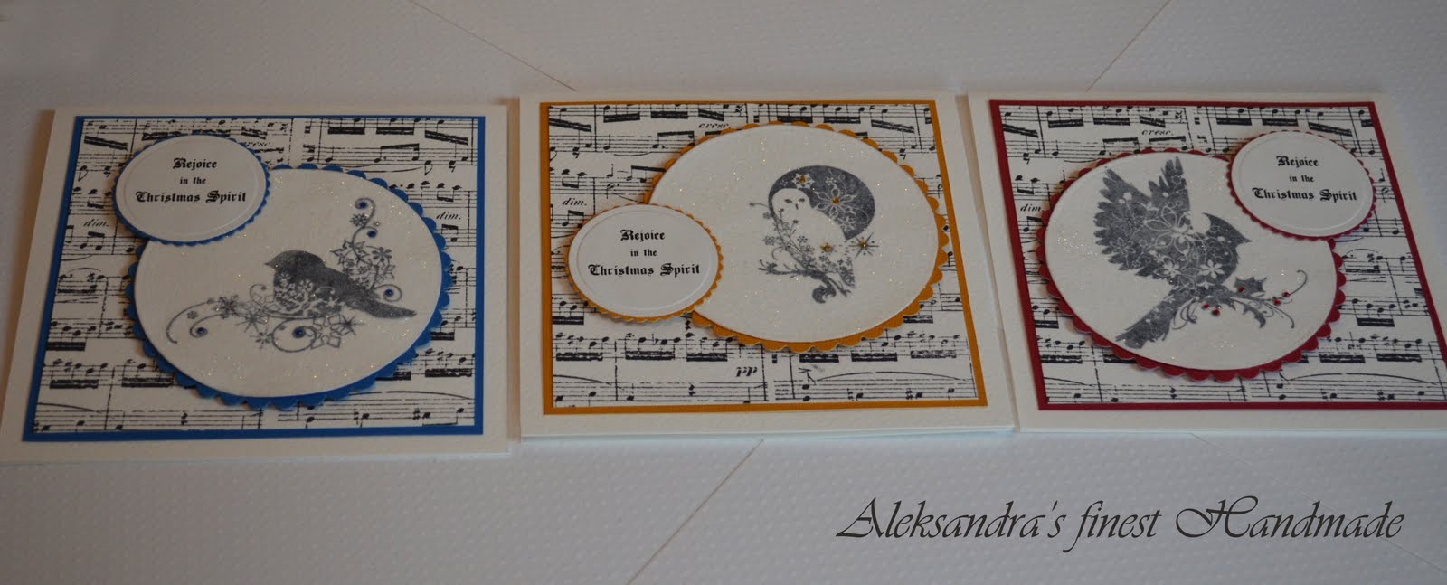 Hello to all. I managed to catch a moment again to write a quick and short blog post. I have for you this time a collection of greetings, which I named "Rejoice" and was made for this weeks challenge over at "Less is More - Week 42", which features Silhouettes. I used a set of stamps from "Inkadinkado - Morphic Birds", which I stamped with a black ink and then work over them with a "Dryer Sheet tehnique", which give to an impretion a special "frozen" look. I saw this tehnique used on one of the last cards from incredibly talented Mona L. Pendleton and I was so thrilled that I had to try it myself and the theme over at Less is More seemed more than perfect for it. I made three cards - in blue, red and warm yellow color.