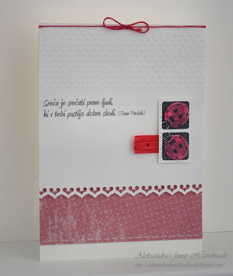 Po dolgem času spet en lep pozdravček vsem. Najprej naj vsem zaželim srečno, zdravo, mirno a veselo, predvsem pa blagoslovljeno leto 2012, v katerega smo vstopili. Pri nas se je začelo pestro in zelo lepo, saj se je najinima punčkama pred dobrim tednom pridružil še bratec Mark. Tako je trenutno pri nas kar živahno, saj trije tako majhni otroci (med vsakim je razlike po eno leto - torej 2,1 in novorojenček) zahtevajo obilo najine energije in časa. Kljub temu pa sem uspela pripraviti svojo prvo voščilnico v letošnjem letu, in sicer za tokratni "CASE Study Challenge", katerega inspiracija je tokrat čudovita kreacija ustvarjalke Jen Rzasa. Spodaj pa je moja voščilnica.