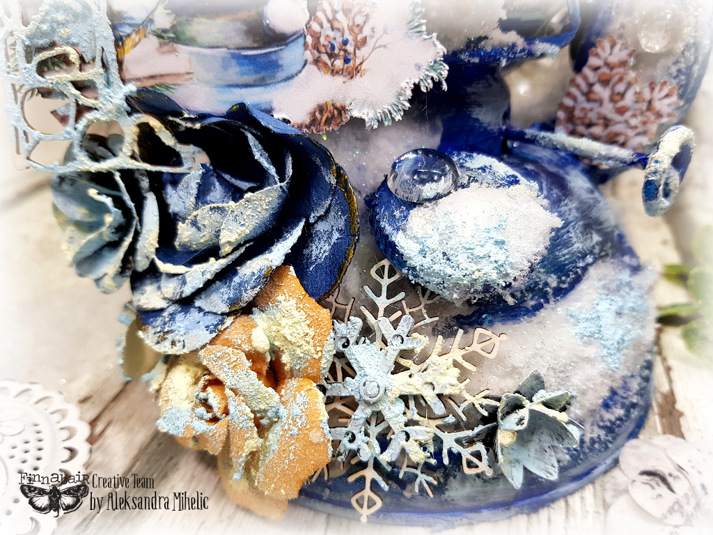 I first covered my Lantern with Heavy White gesso and then with a coat of Plaster Paste. I let it dry and added bits of Platinum Crackle Texture Paste. When dry I colored everything with gorgeous deep blue Metallique color - Royal Blue. I then started adding some snow effects to the lantern, first attaching some cotton wool with Soft Matte Gel and then covering it with gorgeous Snowflake paste, sprinkled with some artificial snow and some White glitter. I added some chipboards, flowers and Finnabair Metal embellishments and covered randomly with Powder Blue Rust Effect Paste from Northern Lights Rust Paste set.